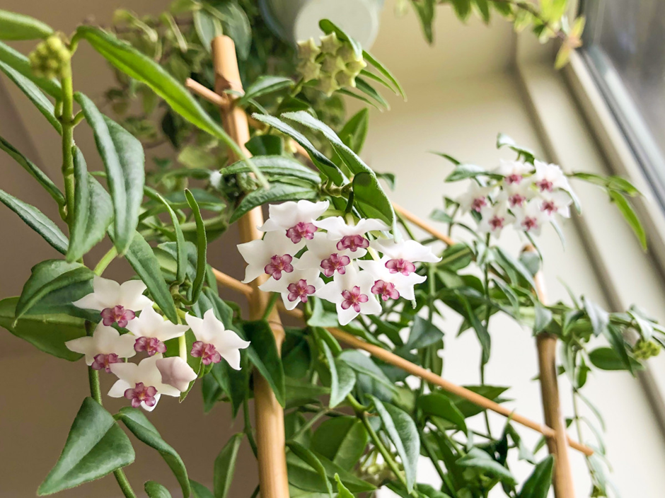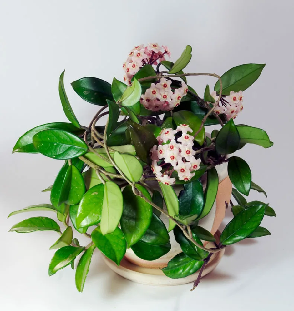 Компактная и нежная, с тонкими свисающими побегами и мелкими листьями. Цветёт белыми звёздчатыми цветками с розовой серединкой, собранными в мини-зонтики. Удивительно, но, несмотря на скромный размер, она способна цвести несколько раз в год. В списке декоративных комнатных растений британского Королевского садоводческого общества хойя белла входит в число самых надёжных видов для дома.