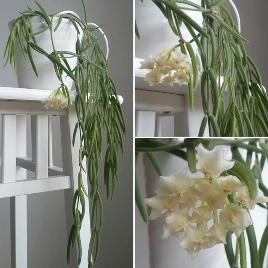 На первый взгляд и не скажешь, что это тоже хойя: тонкие, мягкие, опушённые листья свисают струями, напоминая еловые ветки. В природе она растёт на высоте до 3000 метров, в условиях туманов и рассеянного света. Именно поэтому дома ей нужно яркое, но не прямое освещение и немного больше влаги. Цветы — белые, с лёгким цитрусовым ароматом.