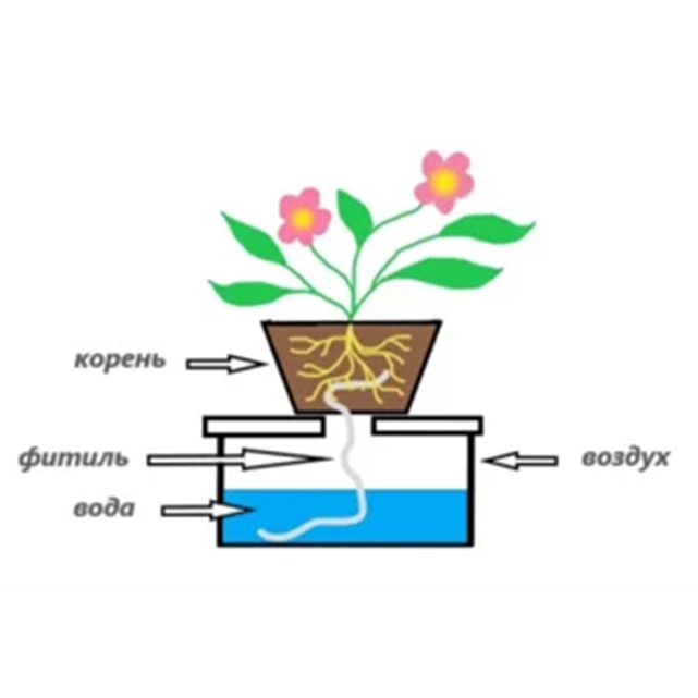 Фитильный полив. Понадобится хлопковый шнур или просто плотная верёвка. Один конец — в банку с водой, другой — в землю. Так у меня однажды выжил мой спатифиллум, когда я на неделю уехала в отпуск. Вот простейшая схема автополива, которую я нашла на сайте https://irecommend.ru