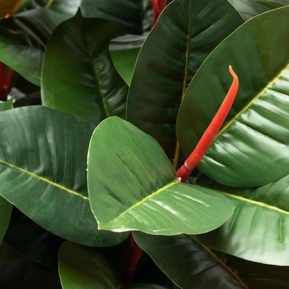 Фикус каучуконосный (Ficus elastica) сразу бросается в глаза. Его крупные, блестящие листья выглядят так, будто кто-то их отполировал. Они плотные, упругие, насыщенного зелёного цвета, а у некоторых сортов — с кремовыми или бордовыми вкраплениями. Форма у растения архитектурная, строгая и очень гармоничная. Такое растение делает интерьер завершённым, как точка в конце предложения.